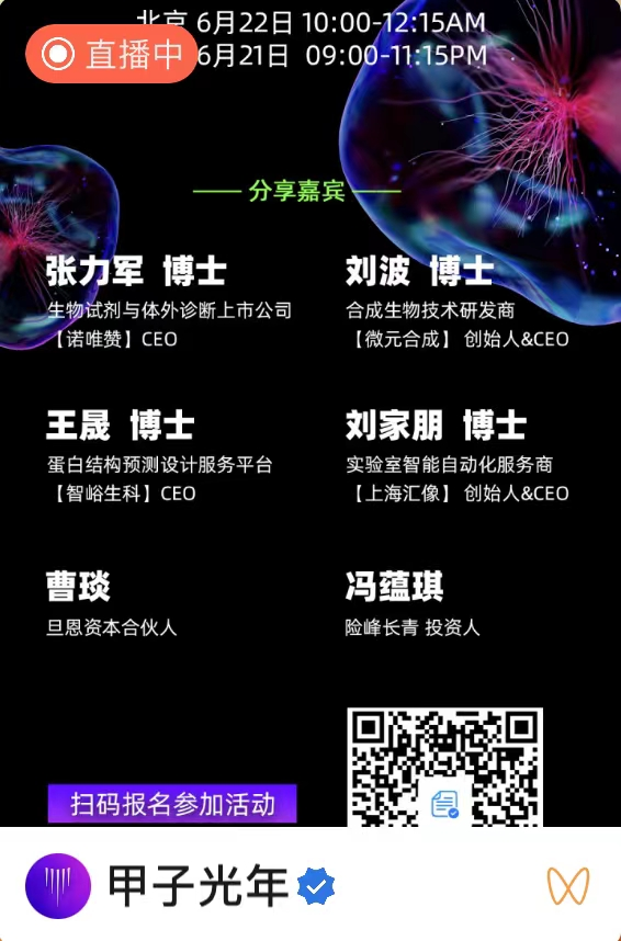 6月22日甲子光年的视频号直播,几位合成生物领域学界、业界、投资界的专家来 做分享。