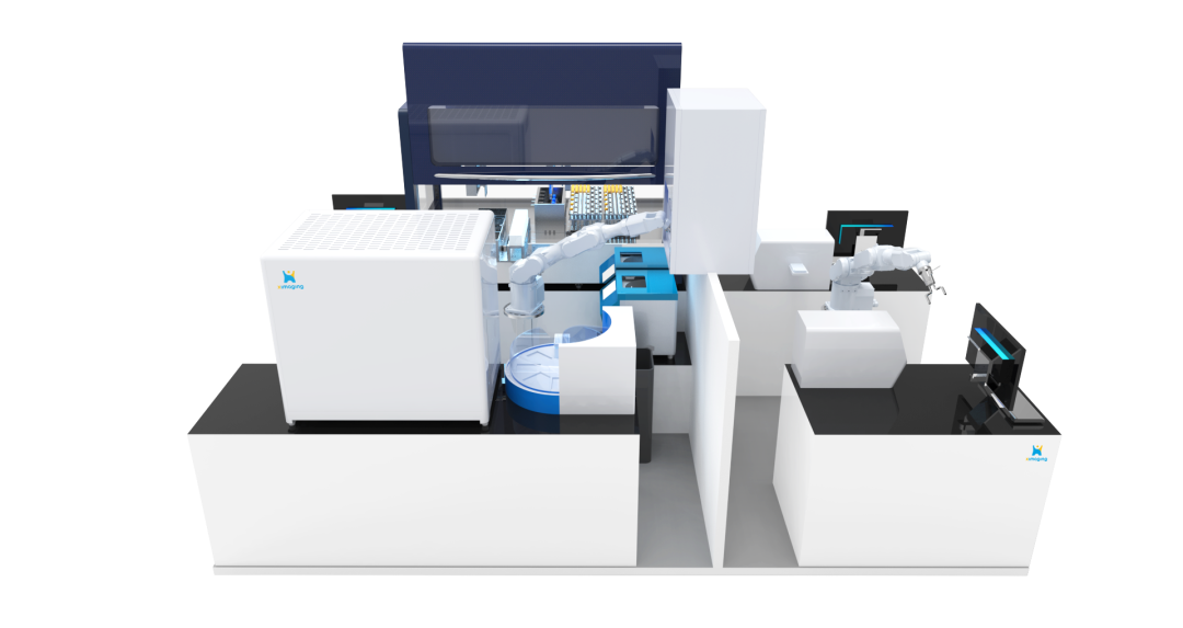 汇像超高通量智能全流程核酸检测工作站,智能链接各设备操作,实现从开盖分杯到核酸提取,PCR体系构建,再到封膜和qPCR检测的全流程自动化、无人化。