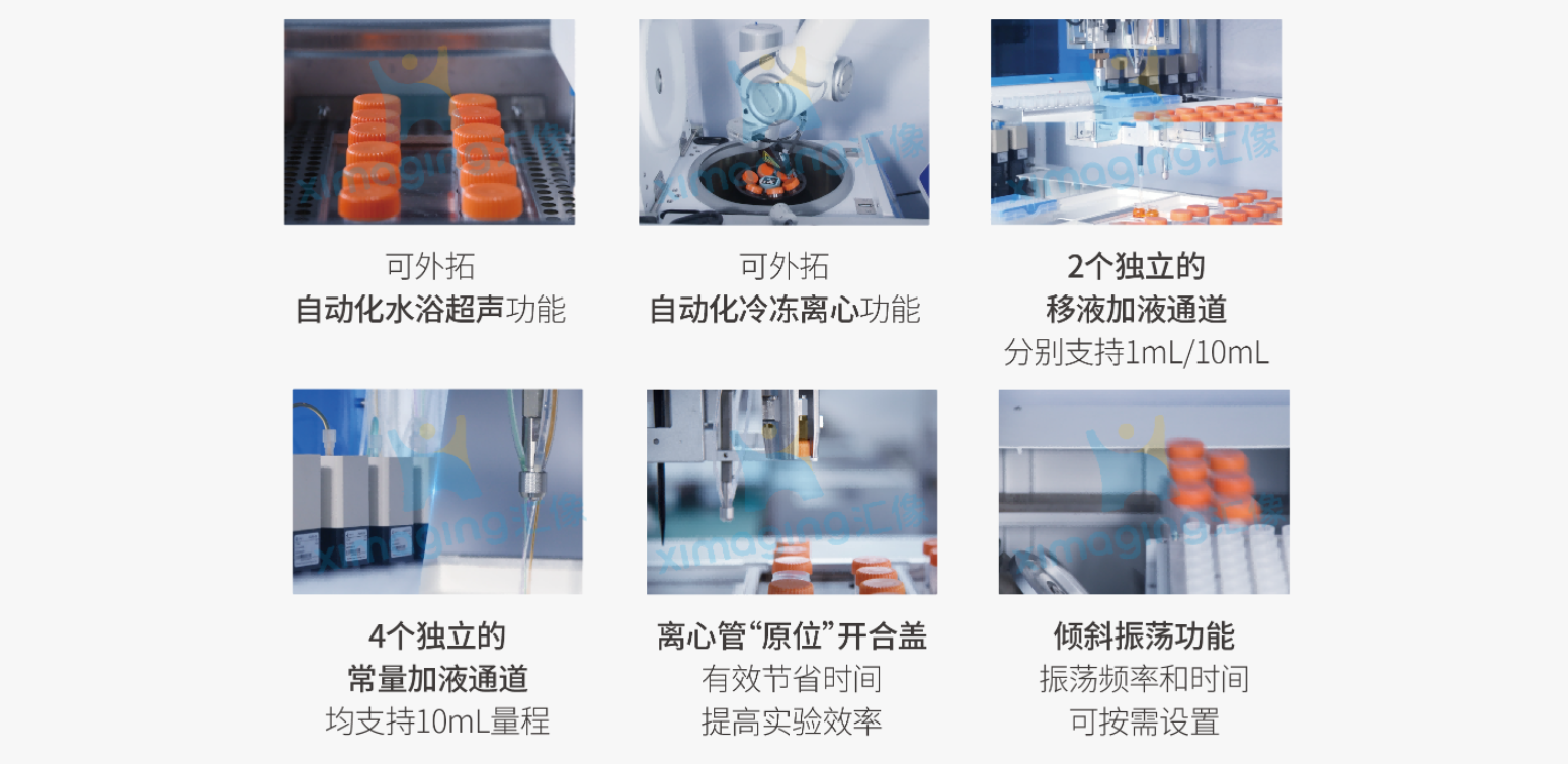 多功能理化样品前处理工作站集自动化加液,移液,振荡等动作于一体,可实现15mL或50mL离心管中样品的前处理自动化,同时,可外拓实现超声和离心自动化等功能,实现复杂前处理全流程的自动化。