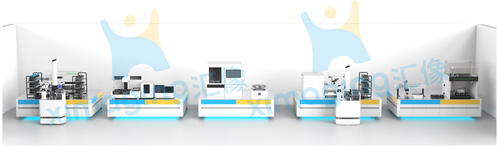 该实验室为全流程无人化、信息化、高通量智慧型水质检测实验室。模块化功能岛设计理念,大大提升了整个系统的运行稳定性、准确性,同时具备了灵活的拓展性。